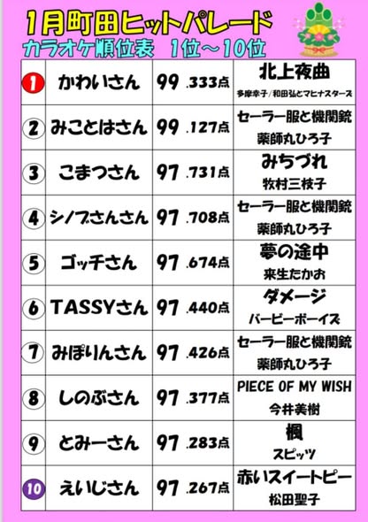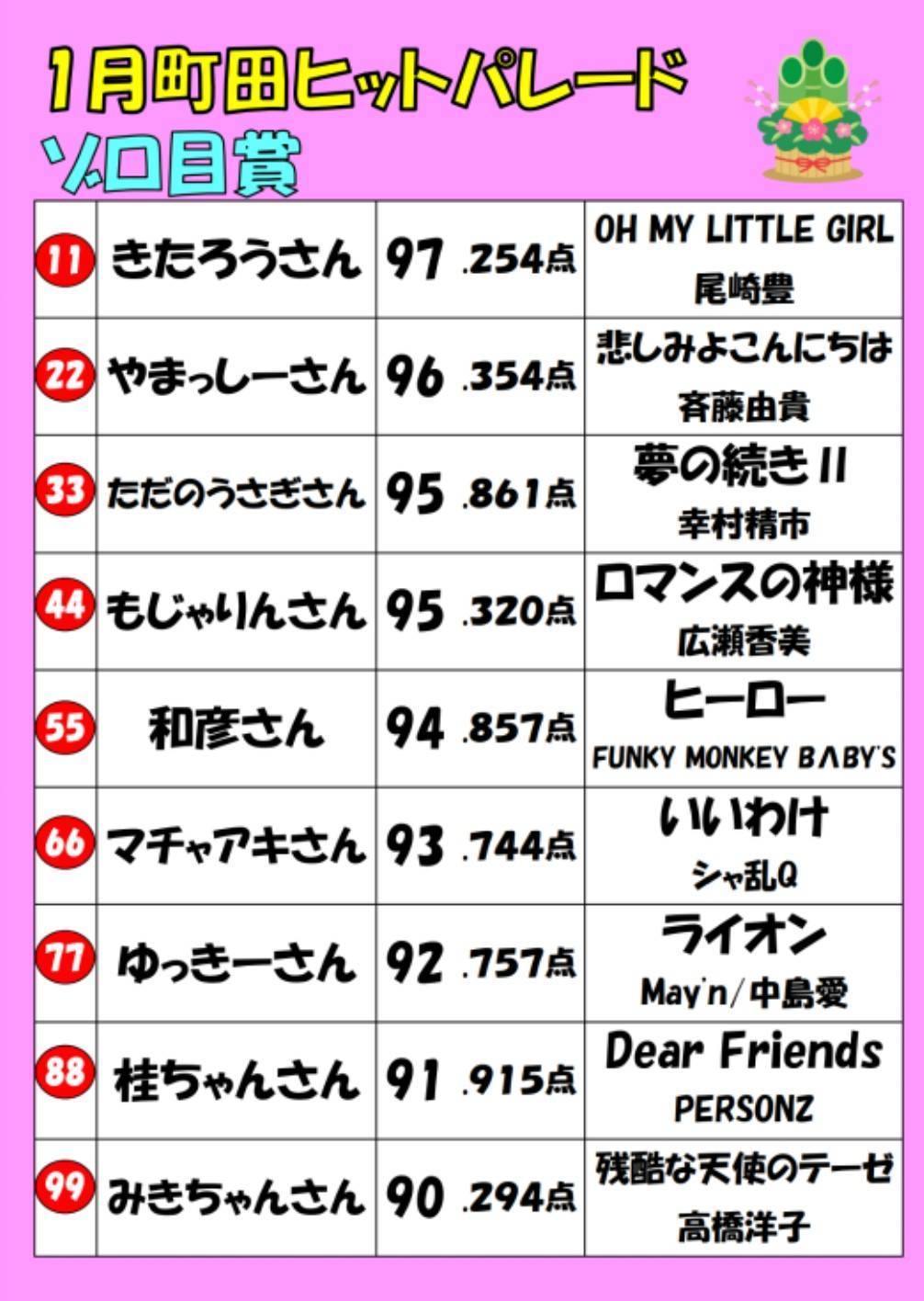 町田ヒットパレード⭐️1月カラオケランキング🎤♬発表🎊㊗️
