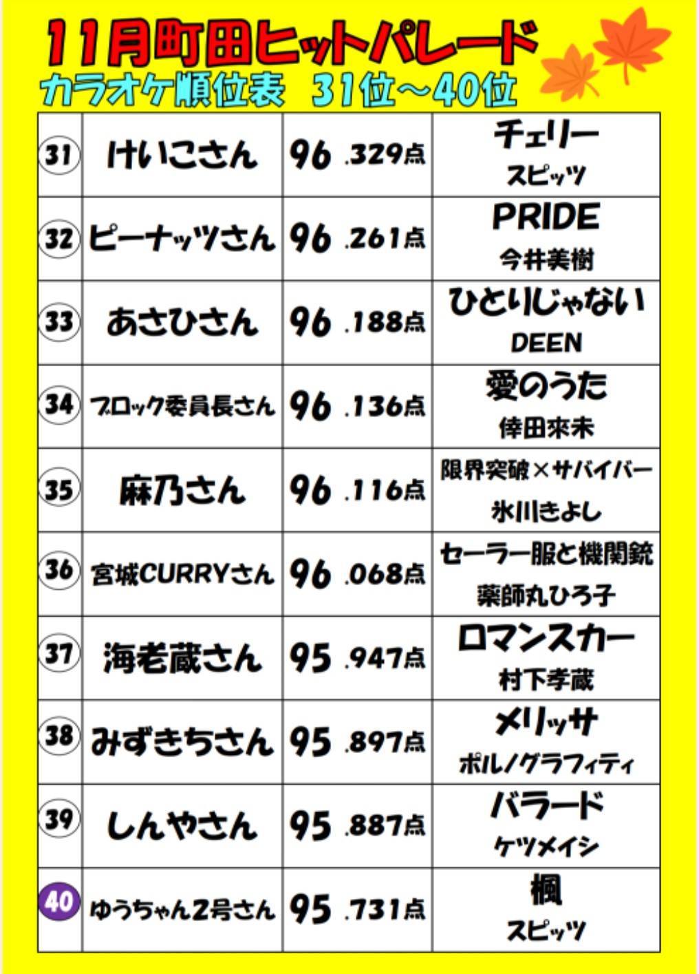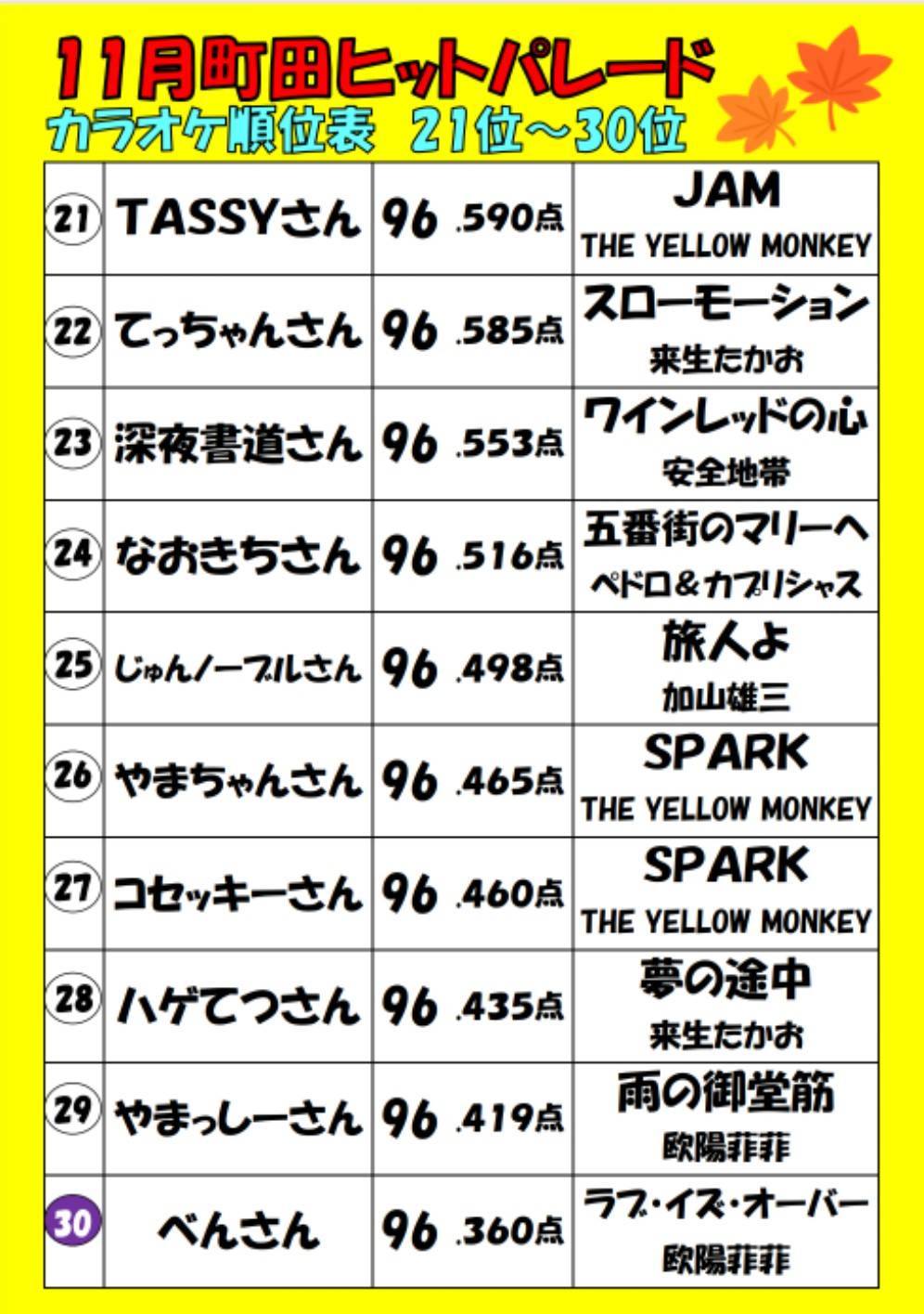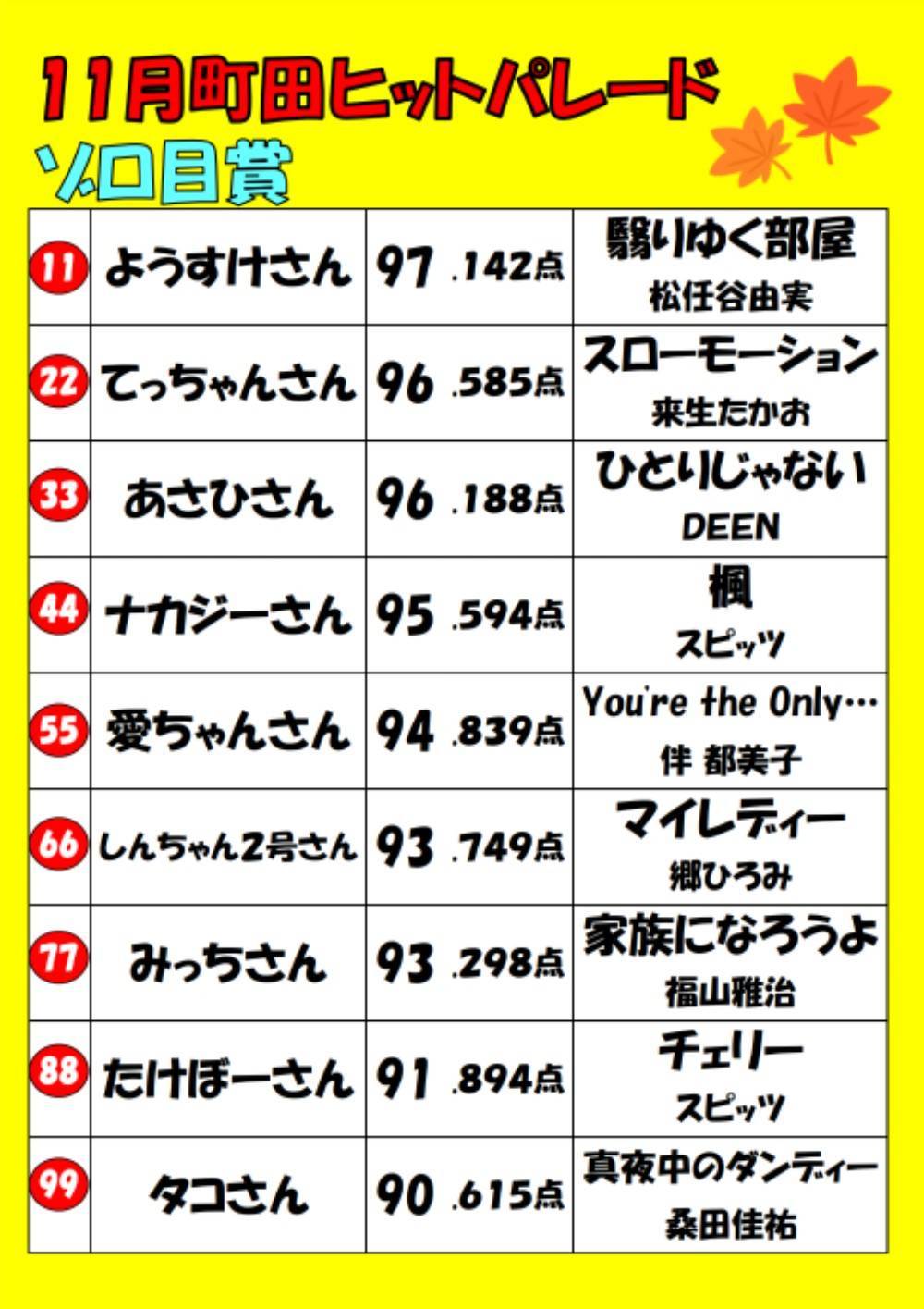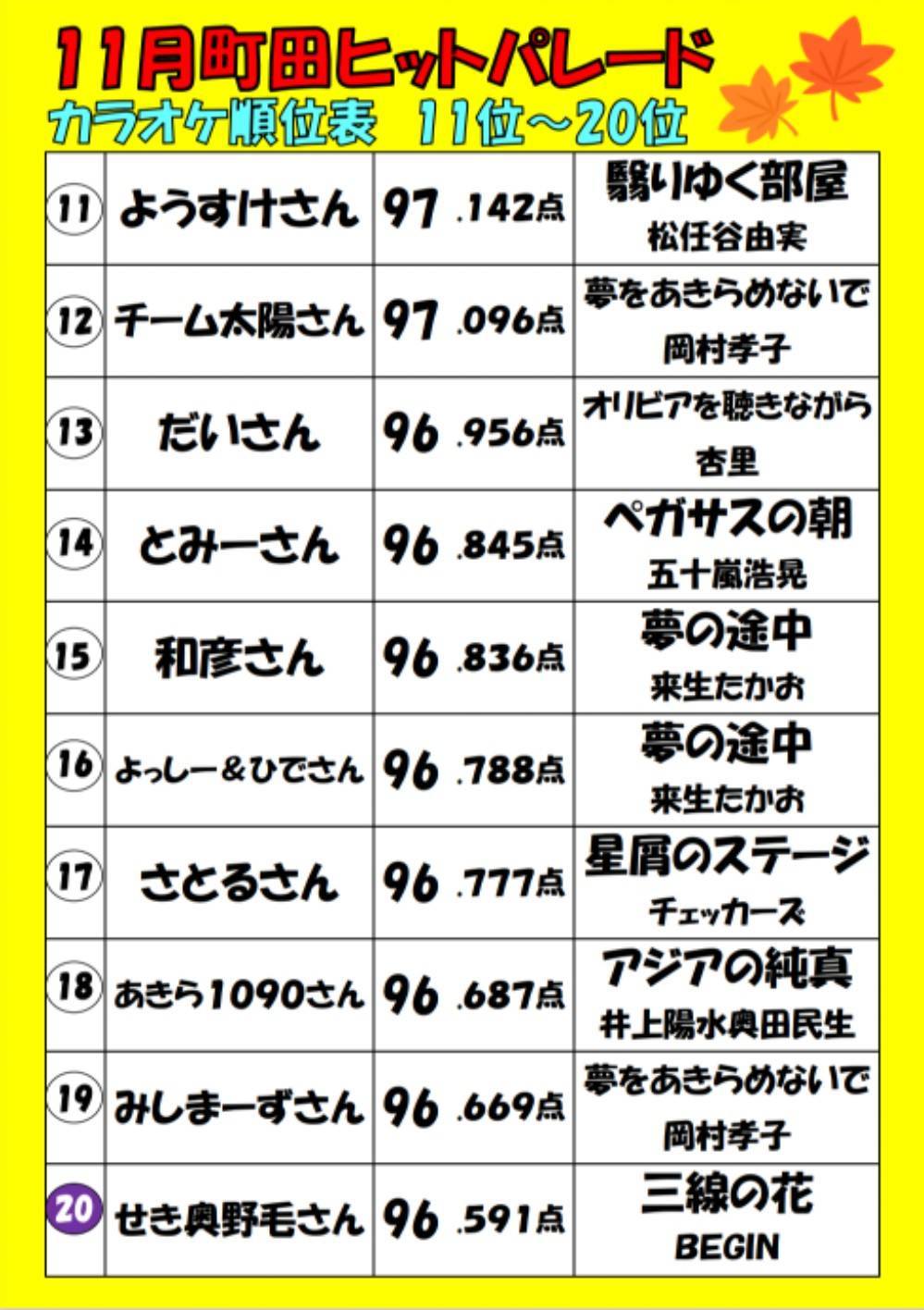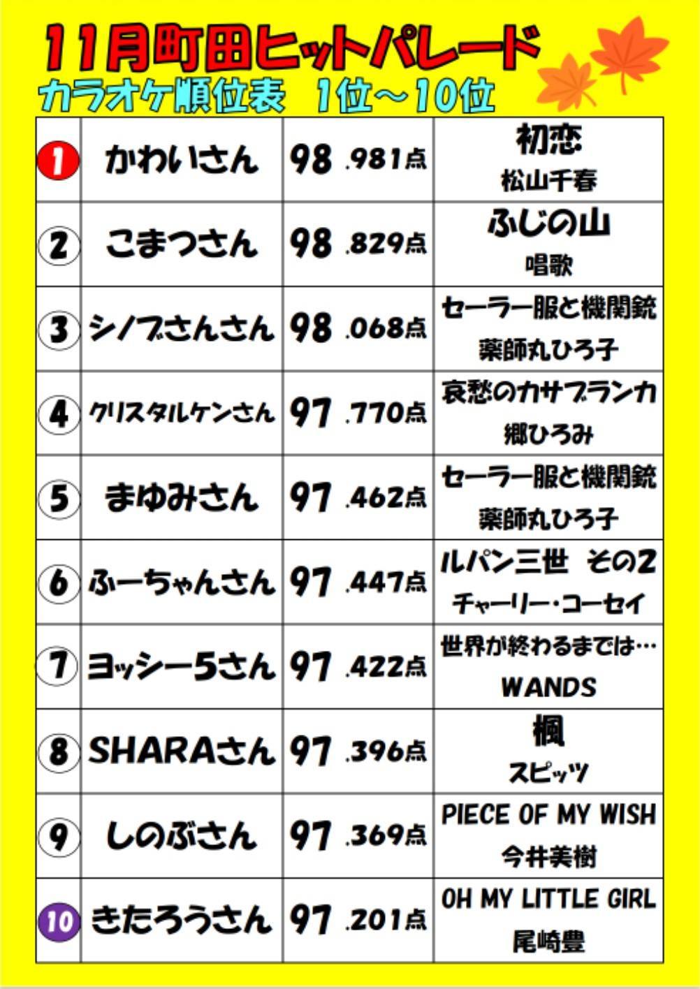 町田ヒットパレード⭐️11月カラオケランキング🎤♬発表🎊㊗️