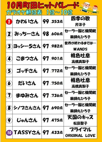 今月10月もカラオケランキング